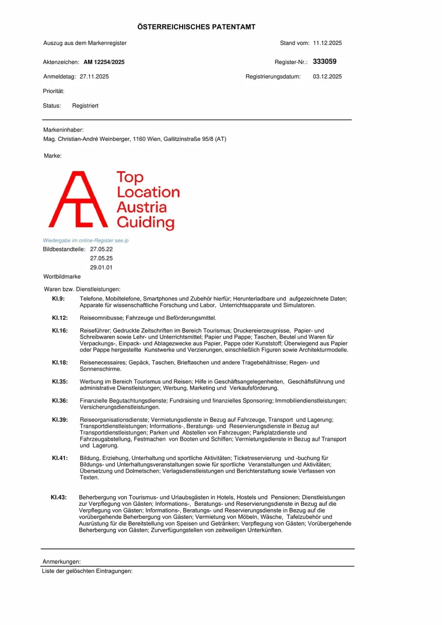 Die Wort-Bild-Marke "TLA Top Location Austria Guiding" ist beim